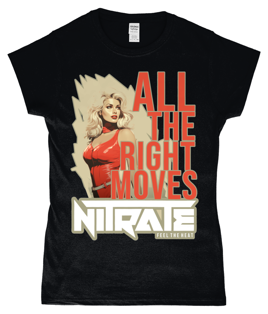 GD72-DS: 70s All The Right Moves Design (Ladies Fit Black T-Shirt)